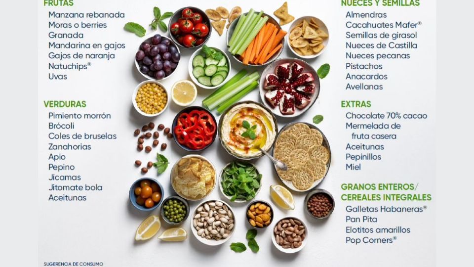 Por último, busca productos de temporada: tienen mejor sabor y suelen ser más accesibles; juega con colores, alturas y recipientes para hacer la tabla más atractiva; e integra alimentos con base de granos enteros o oleaginosas para dar balance.